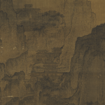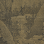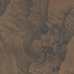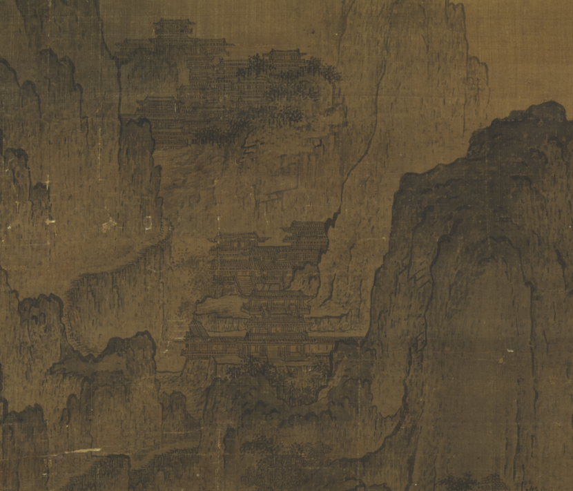画面采用“高远”与“平远”“深远”三法结合的全景式构图,以经典三段式布局构建清晰的空间层次。前景淡墨轻描溪岸寒林,构成近景观赏基点;中景以楼观建筑群为核心,成为画面精神聚焦点,山间小径与溪流串联前后景致,引导观者视线自然游走;后景群峰高耸,左右呼应,山间留白营造云雾缭绕之态,既增强了空间纵深感,又使画面虚实相生。整体构图疏密有致,气脉贯通,寒林的疏朗、楼观的规整与远山的朦胧形成鲜明对比,将溪山的辽阔、楼观的雅致与行旅的灵动有机融合,尽显章法严谨而意趣悠远的审美特质。