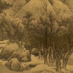 作品以水墨为核心表现手法,辅以淡设色点缀,尽显“淡墨清岚”的审美特质。通过墨色的浓淡干湿变化塑造画面层次:寒林与山石以浓墨重笔刻画,强化苍劲质感;远山与云雾以淡墨轻染,营造悠远朦胧的氛围;仅在楼观的门窗、人物的衣着等细节处施以淡赭、浅绿等淡彩,色彩清雅含蓄,不事张扬。整体墨色苍润清劲,淡彩与水墨有机融合,既表现出北方溪山的萧瑟清幽,又通过柔和的色彩过渡增添了画面的雅致之感,将“清而不冷、幽而有韵”的意境精准传达。