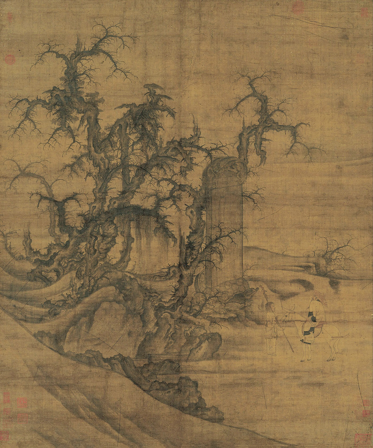 《读碑窠石图》传为北宋画家李成所作,属绢本水墨淡设色作品,纵126.3厘米,横104.9厘米,现藏于日本大阪市立美术馆。此图以立轴全景构图,聚焦荒寒林野中的读碑场景,核心展现“怀古伤今”的幽思意境,营造出萧瑟苍茫的氛围。画面前景以几株枯树与嶙峋窠石为核心,枯树枝干虬曲如蟹爪,枝干疏朗却尽显苍劲,窠石造型奇特,石纹交错;中景矗立着一块残破石碑,碑前有一位戴笠文士驻足凝视,身旁随侍一童仆,文士昂首沉思的姿态精准传递出怀古的怅惘之情;后景以淡墨轻染出远山轮廓,云雾缭绕其间,与前景的荒寒景致呼应,进一步强化了画面的悠远与寂寥。整幅画面景物层次分明,从近到远形成自然的视觉递进,将荒林的萧瑟、碑石的残破与文人的幽思完美融合。